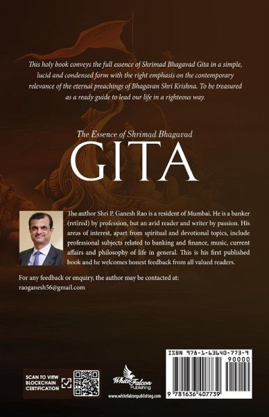 This holy book conveys the full essence of Shrimad Bhagavad Gita in a simple, lucid and condensed form with the right emphasis on the contemporary relevance of the eternal preachings of Bhagavan Shri Krishna. To be treasured as a ready guide to lead our life in a righteous way. About the Author: The author Shri P. Ganesh Rao is a resident of Mumbai. He is a banker (retired) by profession, but an avid reader and writer by passion. His areas of interest, apart from spiritual and devotional topics, include professional subjects related to banking and finance, music, current affairs and philosophy of life in general. This is his first published book and he welcomes honest feedback from all valued readers.