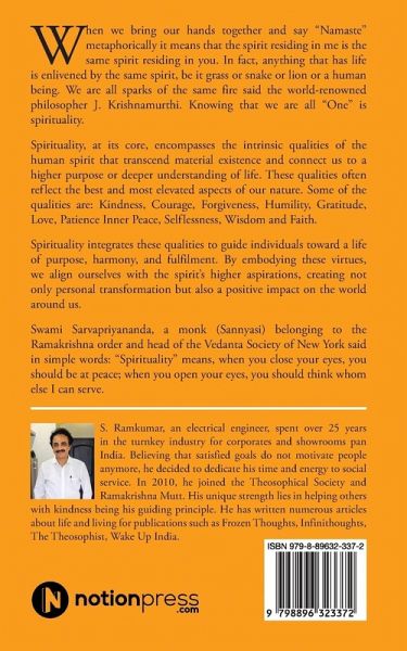 When we bring our hands together and say "Namaste" metaphorically it means that the spirit residing in me is the same spirit residing in you. In fact, anything that has life is enlivened by the same spirit, be it grass or snake or lion or a human being. We are all sparks of the same fire said the world-renowned philosopher J. Krishnamurthi. Knowing that we are all "One" is spirituality. Spirituality, at its core, encompasses the intrinsic qualities of the human spirit that transcend material existence and connect us to a higher purpose or deeper understanding of life. These qualities often reflect the best and most elevated aspects of our nature. Some of the qualities are: Kindness, Courage, Forgiveness, Humility, Gratitude, Love, Patience Inner Peace, Selflessness, Wisdom and Faith. Spirituality integrates these qualities to guide individuals toward a life of purpose, harmony, and fulfilment. By embodying these virtues, we align ourselves with the spirit's higher aspirations, creating not only personal transformation but also a positive impact on the world around us. Swami Sarvapriyananda, a monk (Sannyasi) belonging to the Ramakrishna order and head of the Vedanta Society of New York said in simple words: "Spirituality means, "when you close your eyes, you should be at peace; when you open your eyes, you should think whom else I can serve.