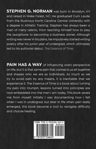 Pain has a way of influencing one's perspective on life, but it is that same pain that connects us all together and shapes who we are as individuals. As much as we try to avoid pain by any means, it is inevitable that we experience it. The Essence of Time is a book about turning my pain into triumph; lessons turned into principles are now embedded into the man I am today. This book saved me from myself. Initially I was documenting how I felt when I was in undergrad, but later in life when pain really emerged, this book became a tool to navigate difficulty and choose healing.