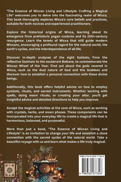 "The Essence of Wiccan Living and Lifestyle: Crafting a Magical Life" welcomes you to delve into the fascinating realm of Wicca. This book thoroughly explores Wicca's core beliefs and practices, suitable for both novices and experienced practitioners. Explore the historical origins of Wicca, learning about its emergence from prehistoric pagan customs and its 20th-century resurgence. Learn the tenets of Wicca that still guide modern Wiccans, encouraging a profound regard for the natural world, the earth's cycles, and the interdependence of all life. Discover in-depth analyses of the eight Sabbats, from the reflective Samhain to the exuberant Beltane, to commemorate the Wiccan Wheel of the Year. Find out about the gods revered in Wicca, such as the dual nature of God and the Goddess and discover how to establish a personal connection with these divine beings. Additionally, this book offers helpful advice on how to employ symbols, rituals, and sacred instruments. Whether working with spells, doing moon rituals, or creating your altar, you'll get insightful advice and detailed directions to help you improve. Accept the magical activities at the core of Wicca, such as working with crystals, herbs, and moon phases. These components can be incorporated into your everyday life to create a magical life that is harmonious, balanced, and purposeful. More than just a book, "The Essence of Wiccan Living and Lifestyle" is an invitation to change your life and establish a close connection with the sacred cycles of the natural world. Take a beautiful voyage with us and learn what makes a life truly magical.