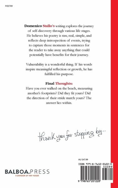 Domenico Stallo's writing explores the journey of self-discovery through various life stages. He believes his poetry is raw, real, simple, and reflects deep introspection of events, trying to capture those moments in sentences for the reader to take away anything that could potentially have benefits for their journey. Vulnerability is a wonderful thing. If his words inspire meaningful reflection or growth, he has fulfilled his purpose. Final Thoughts: Have you ever walked on the beach, measuring another's footprints? Did they fit yours? Did the direction of their stride match yours? The answer lies within.