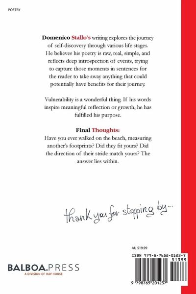 Domenico Stallo's writing explores the journey of self-discovery through various life stages. He believes his poetry is raw, real, simple, and reflects deep introspection of events, trying to capture those moments in sentences for the reader to take away anything that could potentially have benefits for their journey. Vulnerability is a wonderful thing. If his words inspire meaningful reflection or growth, he has fulfilled his purpose. Final Thoughts: Have you ever walked on the beach, measuring another's footprints? Did they fit yours? Did the direction of their stride match yours? The answer lies within.