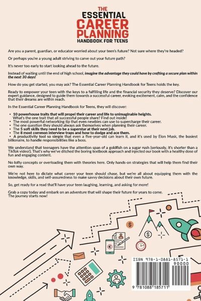 Are you a parent, guardian, or educator worried about your teen's future? Not sure where they're headed? Or perhaps you're a young adult striving to carve out your future path? It's never too early to start looking ahead to the future. Instead of waiting until the end of high school, imagine the advantage they could have by crafting a secure plan within the next 30 days! How do you get started, you may ask? The Essential Career Planning Handbook for Teens holds the key. Ready to empower your teen with the keys to a fulfilling life and the financial security they deserve? Discover our expert guidance, designed to guide them towards a successful career, evoking excitement, calm, and the confidence that their dreams are within reach. In the Essential Career Planning Handbook for Teens, they will discover: * 10 powerhouse traits that will propel their career and life to unimaginable heights. What's the one trait that all successful people share? Find out inside! * The most powerful networking tip that even newbies can use to supercharge their career. * The one question they should always ask themselves when planning their career. * The 5 soft skills they need to be a superstar at their next job. * The 8 most common interview traps and how to dodge and ace them. * A productivity tool so simple that even a five-year-old can learn it, and it's used by Elon Musk, the busiest billionaire, to handle responsibilities like a boss. We understand that teenagers have the attention span of a goldfish on a sugar rush (seriously, it's shorter than a TikTok video!). That's why we've ditched the boring textbook approach and injected our book with a healthy dose of fun and engaging content. No lofty concepts or overloading them with theories here. Only hands-on strategies that will help them find their own way. We're not here to dictate what career your teen should chase, but we're all about equipping them with the knowledge, skills, and self-assuredness to make savvy decisions about their own future. So, get ready for a read that'll have your teen laughing, learning, and asking for more! Click "Buy with 1-click" now to grab a copy today and embark on an adventure that will shape their future for years to come. The journey starts now!