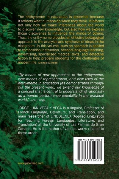 Contents: John T. Gage: The Enthymeme Within Reason - Jorge Juan Vega y Vega: What Can the Enthymeme Do for Education Today? - Jorge Juan Vega y Vega: Popularizing the Enthymeme: "Fans" for Aristotle - Michael Dennis Hood: The Enthymeme as a Practical Rhetoric Concept for Teaching Composition - Michael Dennis Hood: The Role of the Enthymeme in the Connection Between Reading and Writing - Michael Dennis Hood: The Place of the Enthymeme in Composition Studies - Michael Dennis Hood: Essential Modern Readings on the Enthymeme - Jorge Juan Vega y Vega: Language, Image and Reasoning: Learning with Enthymemes - Jorge Juan Vega y Vega: The Integrated Method: Cognitive and Expressive Skills in the Second-Language Classroom - Daniela Ventura: The Process of Reasoning in Advertising - Sandra Marrero Morales: The Enthymeme in Composition Studies: Discourse Analysis in Specialized Medical Texts - Daniela Ventura/Jorge Juan Vega y Vega: The Enthymeme in Detective Novels - Jorge Juan Vega y Vega: The Enthymeme for Educational Purposes Today.