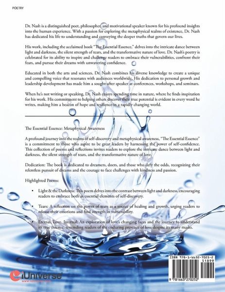 Dr. Nash is a distinguished poet, philosopher, and motivational speaker known for his profound insights into the human experience. With a passion for exploring the metaphysical realms of existence, Dr. Nash has dedicated his life to understanding and conveying the deeper truths that govern our lives. His work, including the acclaimed book "The Essential Essence," delves into the intricate dance between light and darkness, the silent strength of tears, and the transformative nature of love. Dr. Nash's poetry is celebrated for its ability to inspire and challenge readers to embrace their vulnerabilities, confront their fears, and pursue their dreams with unwavering confidence. Educated in both the arts and sciences, Dr. Nash combines his diverse knowledge to create a unique and compelling voice that resonates with audiences worldwide. His dedication to personal growth and leadership development has made him a sought-after speaker at conferences, workshops, and seminars. When he's not writing or speaking, Dr. Nash enjoys spending time in nature, where he finds inspiration for his work. His commitment to helping others discover their true potential is evident in every word he writes, making him a beacon of hope and resilience in a rapidly changing world.