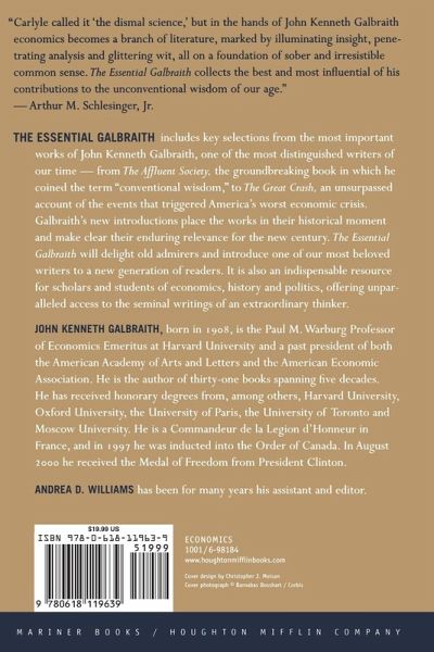 THE ESSENTIAL GALBRAITH includes key selections from the most important works of John Kenneth Galbraith, one of the most distinguished writers of our time - from THE AFFLUENT SOCIETY, the groundbreaking book in which he conined the tern "conventional wisdom," to THE GREAT CRASH, an unsurpassed account of the events that triggered America's worst economic crisis. Galbraith's new introductions place the works in their historical moment and make clear their enduring relevance for the new century. THE ESSENTIAL GALBRAITH will delight old admirers and introduce one of our most beloved writers to a new generation of readers. It is also an indispensable resource for scholars and students of economics, history, and politics, offering unparalleled access to the seminal writings of an extraordinary thinker.