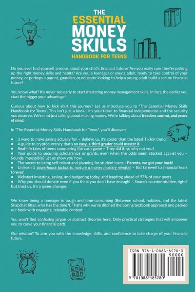 Do you ever find yourself anxious about your child's financial future? Are you really sure they're picking up the right money skills and habits? Are you a teenager or young adult, ready to take control of your money, or perhaps a parent, guardian, or educator looking to help a young adult build a secure financial future? You know what? It's never too early to start mastering money management skills. In fact, the earlier you start the bigger your advantage! Curious about how to kick start this journey? Let us introduce you to "The Essential Money Skills Handbook for Teens". This isn't just a book - it's your ticket to financial independence and the security you deserve. We're not just talking about making money. We're talking about freedom, control, and peace of mind. In "The Essential Money Skills Handbook for Teens", you'll discover:3 ways to make saving actually fun - Believe us, it's cooler than the latest TikTok trend! A guide to cryptocurrency that's so easy, a third-grader could master it. Real-life tales of teens conquering the cash game - They did it, so why not you? Your guide to securing scholarships or grants, even when the odds seem stacked against you - Sounds impossible? Let us show you how. The secret to being self-reliant and planning for student loans - Parents, we got your back! Unleash 3 powerhouse tactics to nurture a money mastery mindset - Bid farewell to financial fears forever! Kickstart investing, saving, and budgeting today, and leapfrog ahead of 97% of your peers. Why you should donate even if you think you don't have enough! - Sounds counterintuitive, right? You'll find out why soon... Taxes explained in a fun, non-boring way - Who knew taxes could be interesting? Staying ahead of the game: Learn how to spot financial frauds and shield yourself from them - Yes, like a financial superhero! We know being a teenager is tough and time-consuming (Between school, hobbies, and the latest Snapchat filter, who has the time?). That's why we've ditched the boring textbook approach and packed our book with engaging, relatable content. You won't find confusing jargon or abstract theories here. Only practical strategies that will empower you to carve your financial path. Our mission? To arm you with the knowledge, skills, and confidence to take charge of your financial future. Are you ready for a read that's as engaging as it is educational? One that'll leave you hungry for more knowledge and eager to take action? Click "Buy Now with 1-Click" to secure a copy of "The Essential Money Skills Handbook for Teens" today. Let's embark on an adventure that will transform your financial future. Your journey starts here and now!