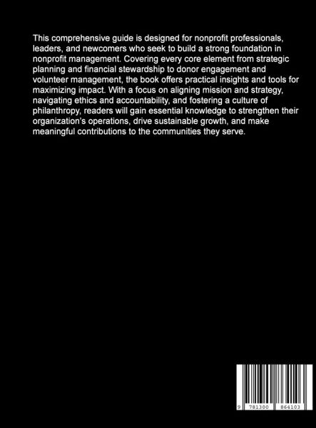 This comprehensive guide is designed for nonprofit professionals, leaders, and newcomers who seek to build a strong foundation in nonprofit management. Covering every core element from strategic planning and financial stewardship to donor engagement and volunteer management, the book offers practical insights and tools for maximizing impact. With a focus on aligning mission and strategy, navigating ethics and accountability, and fostering a culture of philanthropy, readers will gain essential knowledge to strengthen their organization's operations, drive sustainable growth, and make meaningful contributions to the communities they serve.