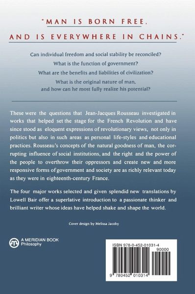 With splendid new translations, these four major works offer a superlative introduction to a great social philosopher whose ideas helped spark a revolution that has still not ended. Can individual freedom and social stability be reconciled? What is the function of government? What are the benefits and liabilities of civilization? What is the original nature of man, and how can he most fully realize his potential? These were the questions that Jean-Jacques Rousseau investigated in works that helped set the stage for the French Revolution and have since stood as eloquent expressions of revolutionary views, not only in politics but also in such areas as personal lifestyles and educational practices. Rousseau's concepts of the natural goodness of man, the corrupting influence of social institutions, and the right and the power of the people to overthrow their oppressors and create new and more responsive forms of government and society are as richly relevant today as they were in eighteenth-century France. Includes: The Social Contract Discourse on Inequality Discourse on the Arts and Sciences "The Creed of a Savoyard Priest" (from Emile)