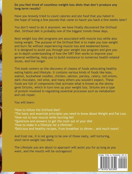 Do you feel tired of countless weight-loss diets that don't produce any long term results? Have you bravely tried to count calories and ate food that you hated in the hope of losing a few pounds that came to haunt you back a few weeks later? You don't need to do it anymore: we have finally discovered the Sirtfood diet. Sirtfood diet is probably one of the biggest trends these days. Most weight loss diet programs are associated with muscle loss while also losing weight. The purpose of the Sirtfood Diet is to make you lose weight and burn fat without experiencing muscle loss and weakened bones. It is designed to assist you through your weight loss program and give you an in-depth understanding of how the SIRT Diet works to improve your general wellbeing, help you to build resistance to numerous health-related issues, and live longer. This book centers on the discovery of classes of foods advocating healthy eating habits and lifestyle. It contains various kinds of foods like kale, walnut, buckwheat noodles, chicken, salmon, parsley, celery, red onions, dark chocolate, red wine, and many others you wouldn't expect. These foods are full of components that activate what is known as the skinny gene Sirtuins, which in turn revs up your weight loss. Sirtuins are a type of protein involved in regulating essential processes such as metabolism and cell repair. You will learn:How to follow the Sirtfood diet?The basic and essential principles you need to know About Weight and Fat LossHow not to lose muscle while burning fat?Questions and answers to get the most out of your dietHow to make it a lifestyle for a lifetime?Delicious and healthy recipes, from breakfast to dinner... and much more! And trust me, it is not going to be one of those nasty, self-torturing, short term weight loss diets. The Lifestyle you are about to approach will assist you for as long as you want, and the results will be outrageous!