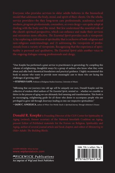 Everyone who provides services to older adults believes in the biomedical model that addresses the body, mind, and spirit of their clients. On the whole, service providers--be they long-term care professionals, academics, social workers, program professionals, counselors, or even clergy--are quite adept at dealing with the body and the mind. But few understand the essential role of the client's spiritual perspective, which can enhance and make their services and ministries more effective. The Essential Spirit provides such a viewpoint: 1) by exploring a definition of spirituality that is inclusive of both religious and non-religious understandings; and 2) addressing the viewpoints of professionals from a variety of viewpoints. Recognizing that the experience of spirituality is personal and qualitative, The Essential Spirit adds another voice to the ongoing dialogue among professionals and clergy.