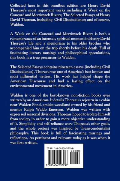 Collected here in this omnibus edition are Henry David Thoreau's most important works including A Week on the Concord and Merrimack Rivers; The Selected Essays of Henry David Thoreau, including Civil Disobedience; and of course, Walden. A Week on the Concord and Merrimack Rivers is both a remembrance of an intensely spiritual moment in Henry David Thoreau's life and a memoriam to his older brother who accompanied him on the trip shortly before his death. Full of fascinating literary musings and philosophical speculations, this book is a true precursor to Walden. The Selected Essays contains nineteen essays (including Civil Disobedience). Thoreau was one of America's best known and most influential writers. His work has helped shape the American Discourse and had a lasting effect on the environmental movement in America. Walden is one of the best-known non-fiction books ever written by an American. It details Thoreau's sojourn in a cabin near Walden Pond, amidst woodland owned by his friend and mentor Ralph Waldo Emerson. Walden was written with expressed seasonal divisions. Thoreau hoped to isolate himself from society in order to gain a more objective understanding of it. Simplicity and self-reliance were Thoreau's other goals, and the whole project was inspired by Transcendentalist philosophy. This book is full of fascinating musings and reflections. As pertinent and relevant today as it was when it was first written.