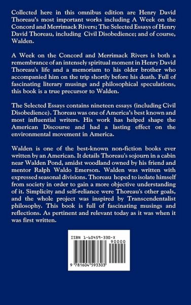 Collected here in this omnibus edition are Henry David Thoreau's most important works including A Week on the Concord and Merrimack Rivers; The Selected Essays of Henry David Thoreau, including Civil Disobedience; and of course, Walden. A Week on the Concord and Merrimack Rivers is both a remembrance of an intensely spiritual moment in Henry David Thoreau's life and a memoriam to his older brother who accompanied him on the trip shortly before his death. Full of fascinating literary musings and philosophical speculations, this book is a true precursor to Walden. The Selected Essays contains nineteen essays (including Civil Disobedience). Thoreau was one of America's best known and most influential writers. His work has helped shape the American Discourse and had a lasting effect on the environmental movement in America. Walden is one of the best-known non-fiction books ever written by an American. It details Thoreau's sojourn in a cabin near Walden Pond, amidst woodland owned by his friend and mentor Ralph Waldo Emerson. Walden was written with expressed seasonal divisions. Thoreau hoped to isolate himself from society in order to gain a more objective understanding of it. Simplicity and self-reliance were Thoreau's other goals, and the whole project was inspired by Transcendentalist philosophy. This book is full of fascinating musings and reflections. As pertinent and relevant today as it was when it was first written.