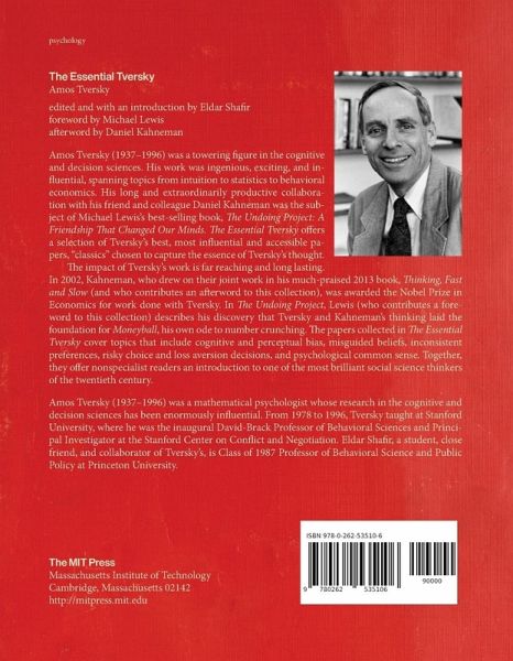Amos Tversky (1937 1996) was a towering figure in the cognitive and decision sciences. His work was ingenious, exciting, and influential, spanning topics from intuition to statistics to behavioral economics. His long and extraordinarily productive collaboration with his friend and colleague Daniel Kahneman was the subject of Michael Lewis's best-selling book, The Undoing Project: A Friendship that Changed Our Minds. The Essential Tversky offers a selection of Tversky's best, most influential and accessible papers, classics chosen to capture the essence of Tversky's thought.