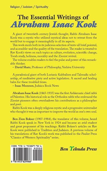 Abraham Isaac Kook (1865-1935) was the first chief rabbi of pre-state Israel. A philosopher and a poet, his creative accomplishments have often been overshadowed by his role as the Orthodox rabbi who embraced the Zionist pioneers. A deeply religious mystic and a progressive universalist, Rabbi Kook thought it as important to improve the world as to improve one's own soul. Ben Zion Bokser (1907-1824), the translator of this volume, heard Rabbi Kook speak in New York in 1924 and became an avid student and great proponent of his teachings. Rabbi Bokser's articles on Rav Kook were published in Tradition and Judaism.