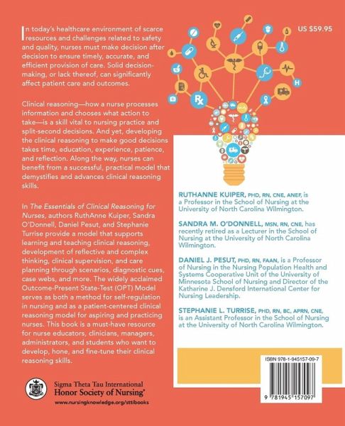 In today's healthcare environment of scarce resources and challenges related to safety and quality, nurses must make decisions after decision to ensure timely, accurate, and efficient provision of care. Solid decision-making, or lack thereof, can significantly affect patient care and outcomes. Clinical reasoning-how a nurse processes information and chooses what action to take-is a skill vital to nursing practice and split-second decisions. And yet, developing the clinical reasoning to make good decisions takes time, education, experience, patience, and reflection. Along the way, nurses can benefit from a successful, practical model that demystifies and advances clinical reasoning skills. The Essentials of Clinical Reasoning for Nurses, authors RuthAnne Kuiper, Sandra O'Donnell, Daniel Pesut, and Stephanie Turrise provide a model that supports learning and teaching clinical reasoning, development of reflective and complex thinking, clinical supervision, and care planning through scenarios, diagnostic cues, case webs, and more. The widely acclaimed Outcome-Present State-Test (OPT) Model serves a both a method for self-regulation in nursing and as a patient-center clinical reasoning model for aspiring and practicing nurses. This book is a must-have resource for nurse educators, clinicians, managers, administrators, and students who want to develop, hone, and fine-tune their clinical reasoning skills.