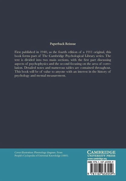First published in 1940, as the fourth edition of a 1911 original, this book forms part of The Cambridge Psychological Library series. The text is divided into two main sections, with the first part discussing aspects of psychophysics and the second focusing on the area of correlation. Detailed notes and numerous tables are contained throughout. This book will be of value to anyone with an interest in the history of psychology and mental measurement.