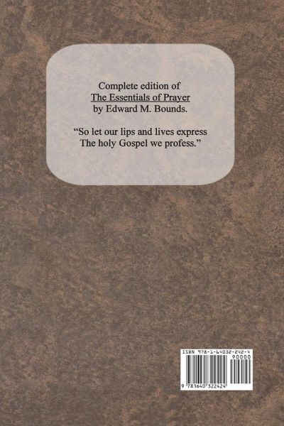 Complete edition of The Essentials of Prayer by Edward M. Bounds. This is a short and impactful classic on prayer, published for the layman. In it, Bounds details the parts of prayer, with much prose to help remember his points. Read with an open heart, this book is helpful to read again and again at various stages of life. "So let our lips and lives express The holy Gospel we profess." No student of thought should be without this historic book. This edition is provided in a slim volume with full text at an affordable price. TABLE OF CONTENTS FOREWORD 3 1. PRAYER TAKES IN THE WHOLE MAN 3 2. PRAYER AND HUMILITY 6 3. PRAYER AND DEVOTION 9 4. PRAYER, PRAISE, AND THANKSGIVING 11 5. PRAYER AND TROUBLE 14 6. PRAYER AND TROUBLE (CONTINUED) 19 7. PRAYER AND GOD'S WORK 21 8. PRAYER AND CONSECRATION 25 9. PRAYER AND A DEFINITE RELIGIOUS STANDARD 29 10. PRAYER BORN OF COMPASSION 31 11. CONCERTED PRAYER 34 12. THE UNIVERSALITY OF PRAYER 37 13. PRAYER AND MISSIONS 40