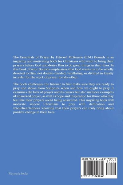 The Essentials of Prayer by Edward McKenzie (E.M.) Bounds is an inspiring and motivating book for Christians who want to bring their prayers before God and desire Him to do great things in their lives. In this book, Pastor Bounds emphasizes that God wants us to be wholly devoted to Him, not double-minded, vacillating, or divided in loyalty in order for the work of prayer to take effect. The book challenges the listener to first make sure they are ready to pray and shows from Scripture when and how we ought to pray. It examines the lack of prayer and its causes but also includes examples of answered prayer, as well as hope and inspiration for those who may feel like their prayers aren't being answered. This inspiring book will motivate sincere Christians to pray with dedication and wholeheartedness, knowing that their prayers can truly bring about positive change in their lives.