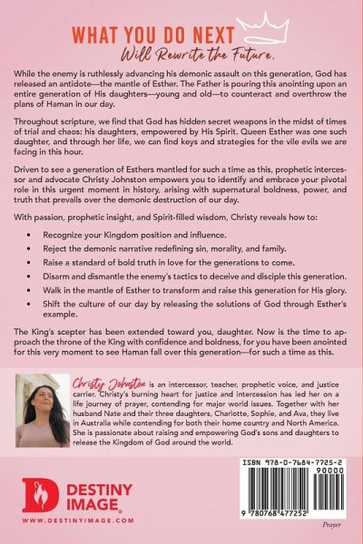 What You Do Next Will Rewrite The Future. While the enemy is ruthlessly advancing his demonic assault on this generation, God has released an antidote-the mantle of Esther. The Father is pouring this anointing upon an entire generation of His daughters-young and old-to counteract and overthrow the plans of Haman in our day. Throughout scripture, we find that God has hidden secret weapons in the midst of times of trial and chaos: his daughters, empowered by His Spirit. Queen Esther was one such daughter, and through her life, we can find keys and strategies for the vile evils we are facing in this hour. Driven to see a generation of Esthers mantled for such a time as this, prophetic intercessor and advocate Christy Johnston empowers you to identify and embrace your pivotal role in this urgent moment in history, arising with supernatural boldness, power, and truth that prevails over the demonic destruction of our day. With passion, prophetic insight, and Spirit-filled wisdom, Christy reveals how to: Recognize your Kingdom position and influence. Reject the demonic narrative redefining sin, morality, and family. Raise a standard of bold truth in love for the generations to come. Disarm and dismantle the enemy's tactics to deceive and disciple this generation. Walk in the mantle of Esther to transform and raise this generation for His glory. Shift the culture of our day by releasing the solutions of God through Esther's example. The King's scepter has been extended toward you, daughter. Now is the time to approach the throne of the King with confidence and boldness, for you have been anointed for this very moment to see Haman fall over this generation-for such a time as this.