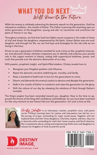 What You Do Next Will Rewrite The Future. While the enemy is ruthlessly advancing his demonic assault on this generation, God has released an antidote-the mantle of Esther. The Father is pouring this anointing upon an entire generation of His daughters-young and old-to counteract and overthrow the plans of Haman in our day. Throughout scripture, we find that God has hidden secret weapons in the midst of times of trial and chaos: his daughters, empowered by His Spirit. Queen Esther was one such daughter, and through her life, we can find keys and strategies for the vile evils we are facing in this hour. Driven to see a generation of Esthers mantled for such a time as this, prophetic intercessor and advocate Christy Johnston empowers you to identify and embrace your pivotal role in this urgent moment in history, arising with supernatural boldness, power, and truth that prevails over the demonic destruction of our day. With passion, prophetic insight, and Spirit-filled wisdom, Christy reveals how to: Recognize your Kingdom position and influence. Reject the demonic narrative redefining sin, morality, and family. Raise a standard of bold truth in love for the generations to come. Disarm and dismantle the enemy's tactics to deceive and disciple this generation. Walk in the mantle of Esther to transform and raise this generation for His glory. Shift the culture of our day by releasing the solutions of God through Esther's example. The King's scepter has been extended toward you, daughter. Now is the time to approach the throne of the King with confidence and boldness, for you have been anointed for this very moment to see Haman fall over this generation-for such a time as this.