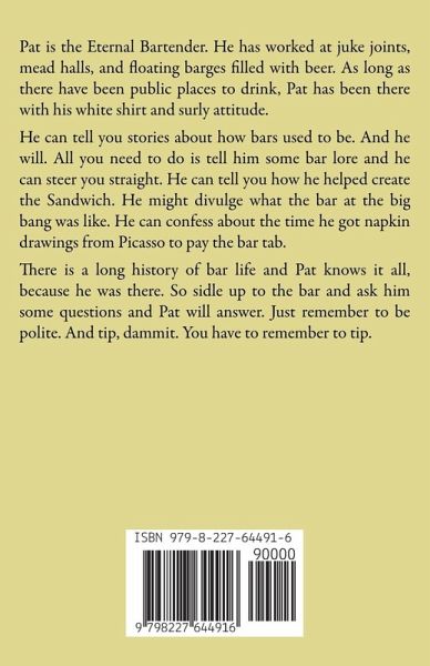 Pat is the Eternal Bartender. He has worked at juke joints, mead halls, and floating barges filled with beer. As long as there have been public places to drink, Pat has been there with his white shirt and surly attitude. He can tell you stories about how bars used to be. And he will. All you need to do is tell him some bar lore and he can steer you straight. He can tell you how he helped create the Sandwich. He might divulge what the bar at the big bang was like. He can confess about the time he got napkin drawings from Picasso to pay the bar tab. There is a long history of bar life and Pat knows it all, because he was there. So sidle up to the bar and ask him some questions and Pat will answer. Just remember to be polite. And tip, dammit. You have to remember to tip.