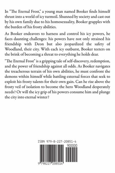 In "The Eternal Frost," a young man named Booker finds himself thrust into a world of icy turmoil. Shunned by society and cast out by his own family due to his homosexuality, Booker grapples with the burden of his frosty abilities. As Booker endeavors to harness and control his icy powers, he faces daunting challenges: his powers have not only strained his friendship with Deon but also jeopardized the safety of Woodland, their city. With each icy outburst, Booker teeters on the brink of becoming a threat to everything he holds dear. "The Eternal Frost" is a gripping tale of self-discovery, redemption, and the power of friendship against all odds. As Booker navigates the treacherous terrain of his own abilities, he must confront the demons within himself while battling external forces that seek to exploit his frosty talents for their own gain. Can he rise above the frosty veil of isolation to become the hero Woodland desperately needs? Or will the icy grip of his powers consume him and plunge the city into eternal winter?