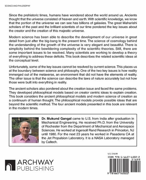 Since the prehistoric times, humans have wondered about the world around us. Ancients thought that the universe consisted of heaven and earth. With scientific knowledge, we know that the portion of the universe we can see has billions of galaxies. The great Maharishi scholars of the past and the brilliant scientists of our time pondered the key issues about the creator and the creation of this majestic universe. Modern science has been able to describe the development of our universe in great detail from just after the big-bang to the present time. The science of cosmology behind the understanding of the growth of the universe is very elegant and beautiful. There is simplicity behind the bewildering complexity of the scientific theories. Still, there are some important issues to be resolved. Many scientists are working to develop a theory of everything to address these deficits. This book describes the related scientific ideas at the conceptual level. Unfortunately, some of the key issues cannot be resolved by current science. This places us at the boundary between science and philosophy. One of the two key issues is how reality immerged out of the metaverse, an environment that did not have the elements of reality. The other issue is that the science can describe the laws of nature accurately but not how those were built into everything in reality. The ancient scholars also pondered about the creation issue and faced the same problems. They developed philosophical models based on creator centric ideas to explain creation. This book considers the ancient philosophical models and modern science of creation as a continuum of human thought. The philosophical models provide possible ideas that are beyond the scientific method. The four ancient models presented in this book are relevant in the modern times.