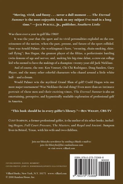 Was there ever a year in golf like 1960? It was the year that the sport and its vivid personalities exploded on the consciousness of the nation, when the past, present, and future of the sport collided. Here was Arnold Palmer, the workingman's hero, "sweating, chain-smoking, shirt-tail flying"; Ben Hogan, the greatest player of the fifties, a perfectionist battling twin demons of age and nerves; and, making his big-time debut, a crew-cut college kid who seemed to have the makings of a champion: twenty-year-old Jack Nicklaus. And of course, the rest: Ken Venturi, Chi Chi Rodriguez, Doug Sanders, Gary Player, and the many other colorful characters who chased around a little white ball-and a dream. Would Palmer win the mythical Grand Slam of golf? Could Hogan win one more major tournament? Was Nicklaus the real thing? Even more than an intimate portrait of these men and their exciting times, The Eternal Summer is also an entertaining, perceptive, and hypnotically readable exploration of professional golf in America.