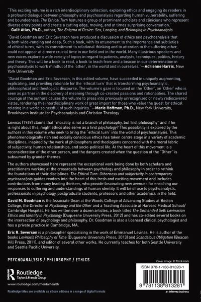Levinas (1969) claims that "morality is not a branch of philosophy, but first philosophy" and if he is right about this, might ethics also serve as a first psychology? This possibility is explored by the authors in this volume who seek to bring the "ethical turn" into the world of psychoanalysis. This phenomenologically rich and socially conscious ethics has taken centre stage in a variety of academic disciplines, inspired by the work of philosophers and theologians concerned with the moral fabric of subjectivity, human relationship, and socio-political life. At the heart of this movement is a reconsideration of the other person, and the dangers created when the question of the "Other" is subsumed by grander themes. The authors showcased here represent the exceptional work being done by both scholars and practitioners working at the crossroads between psychology and philosophy in order to rethink the foundations of their disciplines. The Ethical Turn: Otherness and subjectivity in contemporary psychoanalysis guides readers into the heart of this fresh and exciting movement and includes contributions from many leading thinkers, who provide fascinating new avenues for enriching our responses to suffering and understandings of human identity. It will be of use to psychoanalysts, professionals in psychology, postgraduate students, professors and other academics in the field.