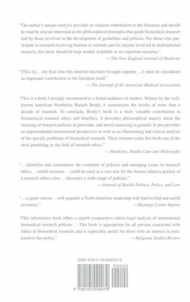 This book analyzes the major issues of research ethics through a careful review of the treatment in official policies on research ethics developed throughout the world (especially North America, Western Europe, and the Pacific Rim). Among the issues covered are animal research, research on human subjects, epidemiological research, genetic research, reproductive research, research on vulnerable subjects, clinical trials, drug approval and the research process, and research on women and minorities. Brody also evaluates the content and the methods of developing these policies in light of his philosophical position of pluralistic casuistry. This is the only book that analyzes all the major issues in research ethics. It is the only book which deals with these issues from an international perspective rather than just a US perspective. Major official policies from important research-intensive countries are reprinted in the appendix (close to 200 plates of otherwise difficult material).