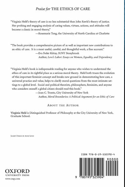 Virginia Held assesses the ethics of care as a promising alternative to the familiar moral theories that serve so inadequately to guide our lives. The ethics of care is only a few decades old, yet it is by now a distinct moral theory or normative approach to the problems we face. It is relevant to global and political matters as well as to the personal relations that can most clearly exemplify care. This book clarifies just what the ethics of care is: what its characteristics are, what it holds, and what it enables us to do. It discusses the feminist roots of this moral approach and why the ethics of care can be a morality with universal appeal. Held examines what we mean by "care," and what a caring person is like. Where other moral theories demand impartiality above all, the ethics of care understands the moral import of our ties to our families and groups. It evaluates such ties, focusing on caring relations rather than simply on the virtues of individuals. The book proposes how such values as justice, equality, and individual rights can "fit together" with such values as care, trust, mutual consideration, and solidarity. In the second part of the book, Held examines the potential of the ethics of care for dealing with social issues. She shows how the ethics of care is more promising than Kantian moral theory and utilitarianism for advice on how expansive, or not, markets should be, and on when other values than market ones should prevail. She connects the ethics of care with the rising interest in civil society, and considers the limits appropriate for the language of rights. Finally, she shows the promise of the ethics of care for dealing with global problems and seeing anew the outlines of international civility.