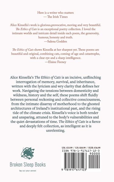 Alice Kinsella's The Ethics of Cats is an incisive, unflinching interrogation of memory, survival, and inheritance, written with the lyricism and wry clarity that defines her work. Navigating the tensions between domesticity and wildness, history and the self, these poems shift fluidly between personal reckoning and collective consciousness, from the intimate disarray of motherhood to the ghosted architectures of Ireland's institutional past, and the rising tide of the climate crisis. Kinsella's voice is both tender and unsparing, attuned to the body's vulnerabilities and the quiet devastations of time. The Ethics of Cats is a fierce and deeply felt collection, as intelligent as it is unrelenting.