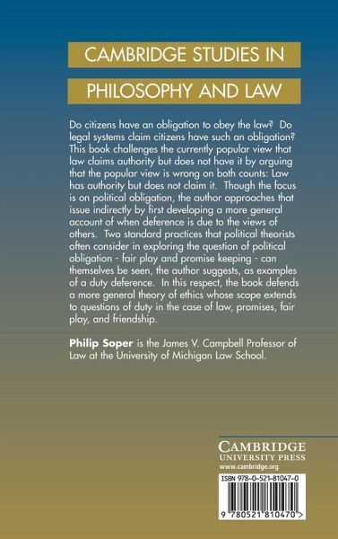 Do citizens have an obligation to obey the law? This book differs from standard approaches by shifting from the language of obedience (orders) to that of deference (normative judgments). The popular view that law claims authority but does not have it is here reversed on both counts: law does not claim authority but has it. Though the focus is on political obligation, the author approaches that issue indirectly by first developing a more general account of when deference is due to the view of others. Two standard practices that political theorists often consider in exploring the question of political obligation - fair-play and promise-keeping - can themselves be seen as examples of a duty of deference. In this respect the book defends a more general theory of ethics whose scope extends beyond the question of political obligation to questions of duty in the case of law, promises, fair play and friendship.