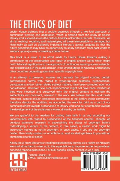 The Ethics Of Diet: A Catena Of Authorities Deprecatory Of The Practice Of Flesh-Eating. This book is a result of an effort made by us towards making a contribution to the preservation and repair of original classic literature. In an attempt to preserve, improve and recreate the original content, we have worked towards: 1. Type-setting & Reformatting: The complete work has been re-designed via professional layout, formatting and type-setting tools to re-create the same edition with rich typography, graphics, high quality images, and table elements, giving our readers the feel of holding a 'fresh and newly' reprinted and/or revised edition, as opposed to other scanned & printed (Optical Character Recognition - OCR) reproductions. 2. Correction of imperfections: As the work was re-created from the scratch, therefore, it was vetted to rectify certain conventional norms with regard to typographical mistakes, hyphenations, punctuations, blurred images, missing content/pages, and/or other related subject matters, upon our consideration. Every attempt was made to rectify the imperfections related to omitted constructs in the original edition via other references. However, a few of such imperfections which could not be rectified due to intentional\unintentional omission of content in the original edition, were inherited and preserved from the original work to maintain the authenticity and construct, relevant to the work. We believe that this work holds historical, cultural and/or intellectual importance in the literary works community, therefore despite the oddities, we accounted the work for print as a part of our continuing effort towards preservation of literary work and our contribution towards the development of the society as a whole, driven by our beliefs. We are grateful to our readers for putting their faith in us and accepting our imperfections with regard to preservation of the historical content. HAPPY READING!