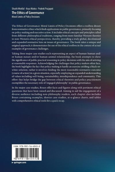 The Ethics of Governance: Moral Limits of Policy Decisions offers a toolbox drawn from normative ethics which finds applications in public governance, primarily focusing on policy making and executive action. It includes ethical concepts and principles culled from different philosophical traditions, ranging from more familiar Western theories to non-Western ethical perspectives, thereby providing a truly global, decolonized and expanded normative lens on issues of governance. The book takes a unique and original approach; it demonstrates the use of the ethical toolbox in the context of actual examples of governance challenges.