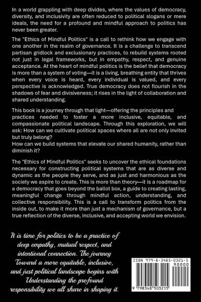 In a world grappling with deep divides, where the values of democracy, diversity, and inclusivity are often reduced to political slogans or mere ideals, the need for a profound and mindful approach to politics has never been greater.The "Ethics of Mindful Politics" is a call to rethink how we engage with one another in the realm of governance. It is a challenge to transcend partisan gridlock and exclusionary practices and to rebuild systems rooted not just in legal frameworks but in empathy, respect, and genuine acceptance. At the heart of mindful politics is the belief that democracy is more than a system of voting-it is a living, breathing entity that thrives when every voice is heard, every individual is valued, and every perspective is acknowledged. True democracy does not flourish in the shadows of fear and divisiveness; it rises in the light of collaboration and shared understanding.This book is a journey through that light-offering the principles and practices needed to foster a more inclusive, equitable, and compassionate political landscape. Through this exploration, we will ask: How can we cultivate political spaces where all are not only invited but truly belong?How can we build systems that elevate our shared humanity, rather than diminish it?"Ethics of Mindful Politics" seeks to uncover the ethical foundations necessary for constructing political systems that are as diverse and dynamic as the people they serve and as just and harmonious as the society we aspire to create. This is more than theory-it is a roadmap for a democracy that goes beyond the ballot box, a guide to creating lasting, meaningful change through mindful action, understanding, and collective responsibility. This is a call to transform politics from the inside out, to make it more than just a mechanism of governance but a true reflection of the diverse, inclusive, and accepting world we envision.