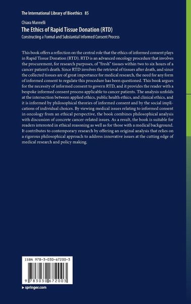 This book offers a reflection on the central role that the ethics of informed consent plays in Rapid Tissue Donation (RTD). RTD is an advanced oncology procedure that involves the procurement, for research purposes, of "fresh" tissues within two to six hours of a cancer patient's death. Since RTD involves the retrieval of tissues after death, and since the collected tissues are of great importance for medical research, the need for any form of informed consent to regulate this procedure has been questioned. This book argues for the necessity of informed consent to govern RTD, and it provides the reader with a bespoke informed consent process applicable to cancer patients. The analysis unfolds at the intersection between applied ethics, public health ethics, and clinical ethics, and it is informed by philosophical theories of informed consent and by the social implications of individual choices. By viewing medical issues relating to informed consent in oncology from an ethical perspective, the book combines philosophical analysis with discussion of concrete cancer-related issues. As a result, the book is suitable for readers interested in ethical reasoning as well as for those with a medical background. It contributes to contemporary research by offering an original analysis that relies on a rigorous philosophical approach to address innovative issues at the cutting edge of medical research and policy making.
