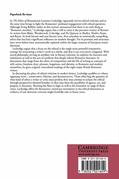 In The Ethics of Romanticism Laurence Lockridge vigorously revives ethical criticism and at the same time brings to light the Romantics' profound engagement with ethical questions. He argues that a will to value is the pervasive motive of Romantic writers from Blake, Wordsworth, Coleridge and De Quincey to Shelley, Hazlitt, Keats and Byron. They articulate a compelling ethics that has had a significant influence on modern thought. Yet its character has never before been systematically explored within the larger contexts of European thought. Lockridge argues that a focus on the ethical dimension of literature is the single most powerful strategy for structuring a writer's work as a whole, and that it can even prove congenial. He gives original, interrelated readings of the eight major British Romantic writers. In discussing the place of ethical criticism in modern letters, he qualifies or refutes opposing views - conservative, Marxist, and deconstructive. His book gives strong evidence of one direction criticism might fruitfully take in future years.