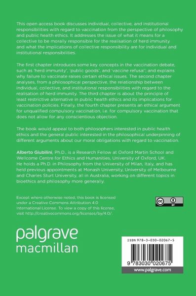 The first chapter introduces some key concepts in the vaccination debate, such as 'herd immunity', 'public goods', and 'vaccine refusal'; and explains why failure to vaccinate raises certain ethical issues. The second chapter analyses, from a philosophical perspective, the relationship between individual, collective, and institutional responsibilities with regard to the realisation of herd immunity. The third chapter is about the principle of least restrictive alternative in public health ethics and its implications for vaccination policies. Finally, the fourth chapter presentsan ethical argument for unqualified compulsory vaccination, i.e. for compulsory vaccination that does not allow for any conscientious objection.
