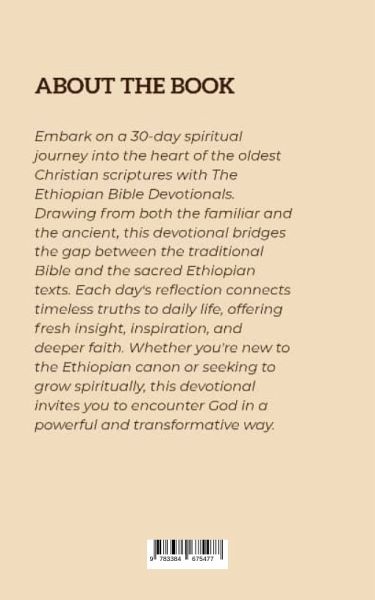 This book is a 30-day devotional journey into the Ethiopian Bible-widely regarded as the oldest and most complete collection of Christian scriptures. Blending timeless wisdom, lost books, and familiar verses, it connects the traditional Bible with ancient Ethiopian texts to guide readers into deeper faith, reflection, and spiritual growth.