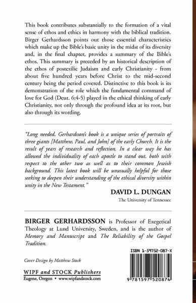 This book contributes substantially to the formation of a vital sense of ethos and ethics in harmony with the biblical tradition. Birger Gerhardsson points out those essential characteristics which make up the Bible's basic unity in the midst of its diversity and, in the final chapter, provides a summary of the Bible's ethos. This summary is preceded by an historical description of the ethos of postexilic Judaism and early Christianity - from about five hundred years before Christ to the mid-second century being the period covered. Distinctive to this book is its demonstration of the role which the fundamental command of love for God (Deut. 6:4-5) played in the ethical thinking of early Christianity, not only through the profound idea at its root, but also through its wording.