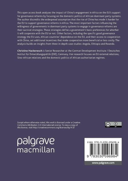 This open access book analyses the domestic politics of African dominant party regimes, most notably African governments' survival strategies, to explain their variance of opinions and responses towards the reforming policies of the EU. The author discredits the widespread assumption that the growing presence of China in Africa has made the EU's task of supporting governance reforms difficult, positing that the EU's good governance strategies resonate better with the survival strategies of governments in some dominant party regimes more so than others, regardless of Chinese involvement. Hackenesch studies three African nations - Angola, Ethiopia and Rwanda - which all began engaging with the EU on governance reforms in the early 2000s. She argues that other factors generally identified in the literature, such as the EU good governance strategies or economic dependence of the target country on the EU, have set additional incentives for African governments to not engage on governance reforms.