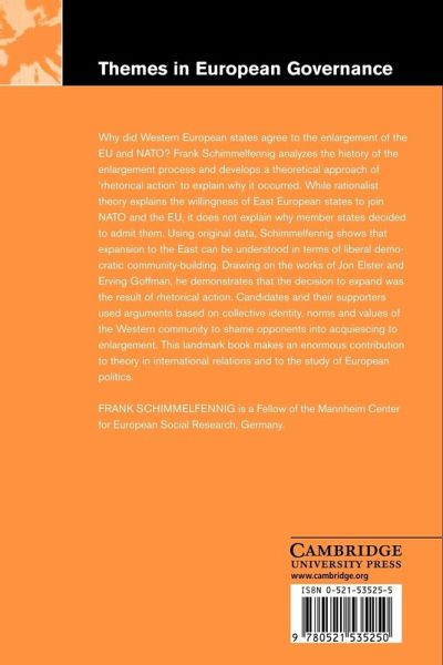 Why did Western European states agree to the enlargement of the EU and NATO? Frank Schimmelfennig analyzes the history of the enlargement process and develops a theoretical approach of 'rhetorical action' to explain why it occurred. While rationalist theory explains the willingness of East European states to join the NATO and EU, it does not explain why member states decided to admit them. Using original data, Schimmelfennig shows that expansion to the East can be understood in terms of liberal democratic community building. Drawing on the works of Jon Elster and Erving Goffman, he demonstrates that the decision to expand was the result of rhetorical action. Candidates and their supporters used arguments based on collective identity, norms and values of the Western community to shame opponents into acquiescing to enlargement. This landmark book makes an enormous contribution to theory in international relations and to the study of European politics.