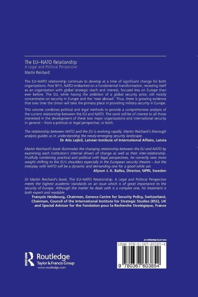 'The relationship between NATO and the EU is evolving rapidly. Martin Reichard's thorough analysis guides us in understanding the newly emerging security landscape.' Atis LejinÅ¡, Latvian Institute of International Affairs, Latvia 'Martin Reichard's book illuminates the changing relationship between the EU and NATO by examining each institution's internal drivers of change as well as their inter-relationship. Fruitfully combining practical and political with legal perspectives, he correctly sees more weight shifting to the EU's shoulders especially in the European security theatre - but the interplay with NATO will be a dynamic and demanding one for a good while yet.' Alyson J. K. Bailes, Director, SIPRI, Sweden 'Dr Martin Reichard's book, The EU-NATO Relationship: A Legal and Political Perspective meets the highest academic standards on an issue which is of great importance to the security of Europe. Although the matter he deals with is a complex one, his treatment is both expert and readable.' Francois Heisbourg, Chairman, Geneva Centre for Security Policy, Switzerland, Chairman, Council of the International Institute for Strategic Studies (IISS), UK and Special Advisor for the Fondation pour la Recherche Stratégique, France '...Reichard's work constitutes an important contribution to the study of the ESDP and of the European security architecture more generally. The book is well-written and...offers an excellent overview of the political and strategic context of the EU-NATO relationship...it deserves to be widely read both by international relations specialists and by international lawyers.' Common Market Law Review 'Commendably comprehensive in its scope and meticulous in its research, the book offers an impressive analysis of the issues at stake, the author having tracked down all manner of official documnets and academic articles relating to the subject...this is a highly useful and important volume that will serve as an excellent reference work for