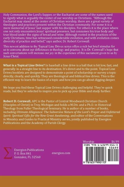 Holy Communion, the Lord's Supper, or the Eucharist are some of the names used to signify what is arguably the center of our worship as Christians. "Although the Eucharist may stand at the center of Christian worship, there are a great variety of theologies and practices present within the Christian community. For some it is a mere memorial of Jesus' last supper with his disciples. For others it is the place where one not only encounters Jesus' spiritual presence, but consumes his true body and true blood under the signs of bread and wine. Although rooted in the practices of the early Christians, time has witnessed considerable evolution, and with evolution comes diversity of practice and belief," says author, Dr. Robert Cornwall. This newest addition to the Topical Line Drives series offers a rich but brief stimulus for us to converse about our differences in theology and practice. It is Dr. Cornwall's hope that such conversations will increase our joy in the experience of this sacrament given to us by Jesus Christ.