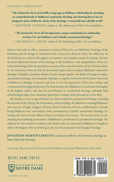 This study presents Hans Urs von Balthasar's theology of the Eucharist and shows its significance for contemporary sacramental theology. Anyone who seeks to offer a systematic account of Hans Urs von Balthasar's theology of the Eucharist and the liturgy is confronted with at least two obstacles. First, his reflections on the Eucharist are scattered throughout an immense and complex corpus of writings. Second, the most distinctive feature of his theology of the Eucharist is the inseparability of his sacramental theology from his speculative account of the central mysteries of the Christian faith. In The Eucharistic Form of God, the first book-length study to explore Balthasar's eucharistic theology in English, Jonathan Martin Ciraulo brings together the fields of liturgical studies, sacramental theology, and systematic theology to examine both how the Eucharist functions in Balthasar's theology in general and how it is in fact generative of his most unique and consequential theological positions. He demonstrates that Balthasar is a eucharistic theologian of the highest caliber, and that his contributions to sacramental theology, although little acknowledged today, have enormous potential to reshape many discussions in the field. The chapters cover a range of themes not often included in sacramental theology, including the doctrine of the Trinity, the Incarnation, and soteriology. In addition to treating Balthasar's own sources-Origen, Gregory of Nyssa, Pascal, Catherine of Siena, and Bernanos-Ciraulo brings Balthasar into conversation with contemporary Catholic sacramental theology, including the work of Louis-Marie Chauvet and Jean-Yves Lacoste. The overall result is a demanding but satisfying presentation of Balthasar's contribution to sacramental theology. The audience for this volume is students and scholars who are interested in Balthasar's thought as well as theologians who are working in the area of sacramental and liturgical theology.