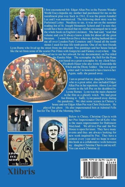 I first encountered Mr. Edgar Allan Poe in the Parents Wonder World Encyclopedia my mother had purchased for me on the installment plan way back in 1961, It was the poem Annabel Lee and I was mesmerized. The following short story was the Purloined Letter. Needless to say, it was not on the summer reading list of St. Joseph Monastery School and I'm sure they would have been shocked that my mother encouraged me to read the whole book on English Literature. She had said, "read that volume and you'll always know a little bit about all the great literature. I wrote Raven Dove when my darling husband drove me all over Loudon Park Cemetery and I found all the tomb stones I used for true life tomb poems. One of my best friends Lynn Barns who lived up the street from me did many Poe paintings and her house looked like the set from some of the scarier Poe Films with Gargoyles and Fantasy everywhere. She allowed me to use her artwork for my documentary on Poe titled the Eureka Man. The screenplay the Bell for the Rune was based on a great screenplay by my client Mary Elizabeth Hauer who also wrote Esmeralda the Witch and the Ebony Soldier. She was a great writer and I'm honored to have known her. Again, sadly she passed away. I am so proud that my daughter, Christine, who is a great artist, also included Edgar Allan Poe in her repertoire. Above Lou and Loretto to the left Poe on his deathbed by Lynne Barnes. Lynn was the main character in the film as a ghostly witch. We had great fun filming it. Sadly, Lynn passed away during the pandemic. We shot some scenes in Chrissy's house and our Edgar Allan Poe was Chris Dickerson. He played his ghost. He also impersonated him at Admiral Fells Inn for The Top of the Morning Show. Below is Chissy, Christine Chavis with her Poe Impersonator David Keltz who is the main impersonator for Baltimore Maryland. We all love Poe and the Poe House is open for tours. They have many events and they are always looking for new work inspired by Poe. They have a contest every year and we hope to enter this book as a collaborative work between my daughter Christine Chavis and myself. You can reach Christine @