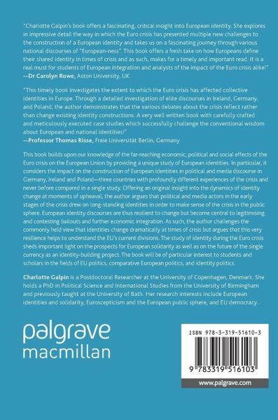 This book builds upon our knowledge of the far-reaching economic, political and social effects of the Euro crisis on the European Union by providing a unique study of European identities. In particular, it considers the impact on the construction of European identities in political and media discourse in Germany, Ireland and Poland-three countries with profoundly different experiences of the crisis and never before compared in a single study. Offering an original insight into the dynamics of identity change at moments of upheaval, the author argues that political and media actors in the early stages of the crisis drew on long-standing identities in order to make sense of the crisis in the public sphere. European identity discourses are thus resilient to change but become central to legitimising and contesting bailouts and further economic integration. As such, the author challenges the commonly held view that identities change dramatically at times of crisis but argues that this very resilience helps to understand the EU's current divisions. The study of identity during the Euro crisis sheds important light on the prospects for European solidarity as well as on the future of the single currency as an identity-building project. The book will be of particular interest to students and scholars in the fields of EU politics, comparative European politics, and identity politics.