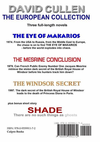 THREE FULL-LENGTH NOVELS. THE EYE OF MAKARIOS - 1974: From the USA to Russia, from the Middle East to Europe, the chase is on to find The Eye of Makarios before the world explodes into chaos. THE MESRINE CONCLUSION - 1978: Can French Public Enemy Number One Jacques Mesrine retrieve the stolen dark secret of the British Royal House of Windsor before his hunters track him down? THE WINDSOR SECRET - 1997: The dark secret of the British Royal House of Windsor leads to the death of Princess Diana in Paris. Who did it? And why? PLUS BONUS SHORT STORY: SHADE - There are no such things as ghosts...